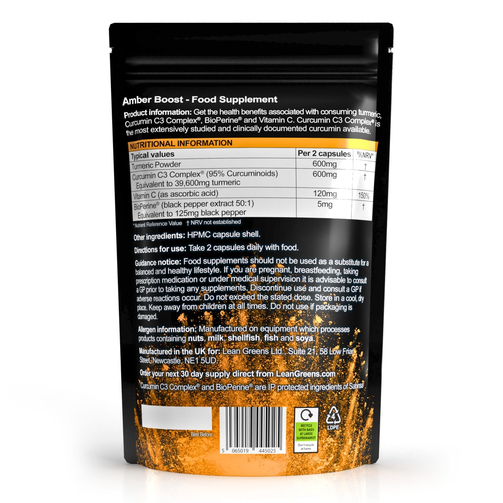 Black pepper extract, Piperine, maximises the absorption of curcumin, the active part of Turmeric.